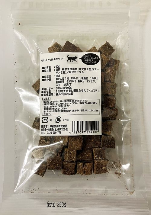 原材料名:鶏肝、鶏軟骨抽出物(非変性Ⅱ型コラーゲン含有)/塩化カリウム
